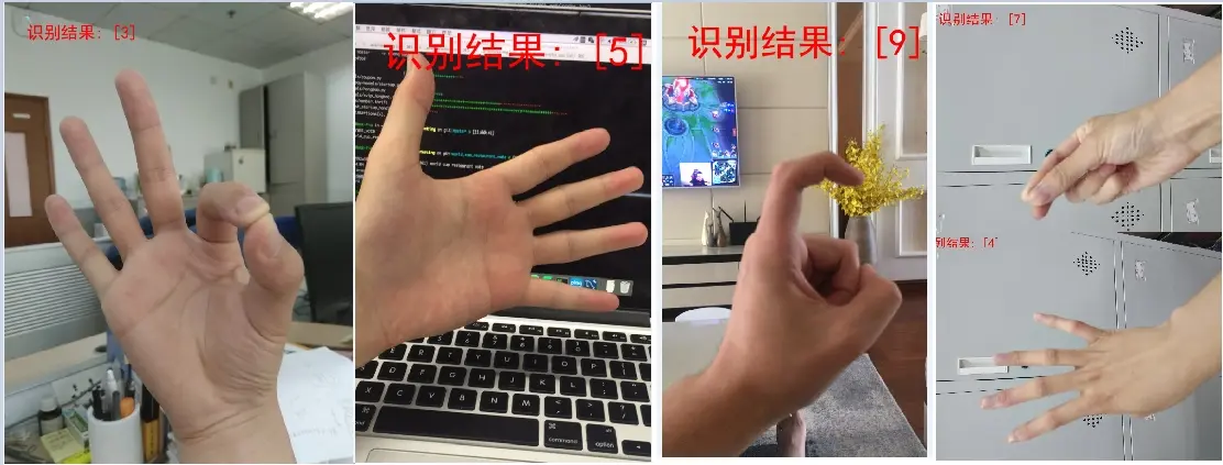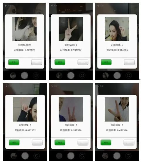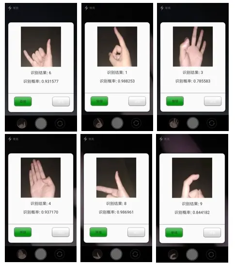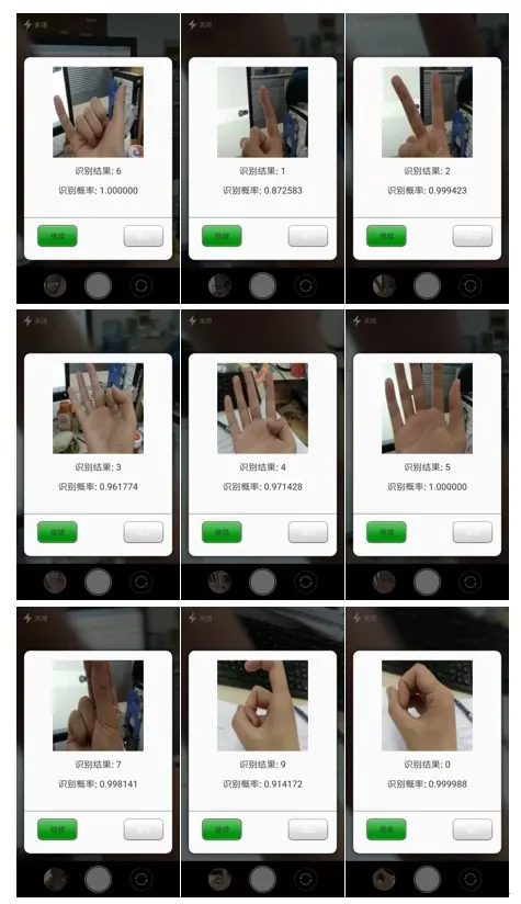 digital_gesture_recognition/model_200中为epoch=200训练得到的模型,也是APP中使用的模型,model_2500 则为epoch=2500训练的模型。在PC端训练得到的模型在训练集、测试集上的accuracy分别为:99.8%和99.5%。在APP上因为面临的环境更加复杂,准确率远没有达到这个数字。在PC端随机测试几张好友拍的照片(在训练集、测试集中均没有出现过),测试结果比较满意,测试结果如下: