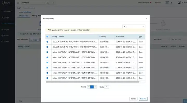 通过 Kyligence ODBC Driver,Tableau 对接 Kyligence 数据源。基于统一的查询入口,Kyligence 自动采集 Tableau 查询历史。查询历史代表了分析场景的模式和频次,被选中的关键查询模式将在 Kyligence 中完成语法检测和验证,并被用于后续的模型自动生成: