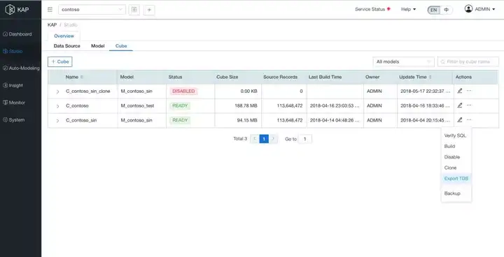 为了更好地实现模型层的互通,Kylgience 支持将数据立方体(Cube)模型一键导出为 Tableau 数据源定义文件 TDS(Tableau Data Source)。Tableau 直接打开 TDS文件,Cube 中定义的维度,度量,层级结构,表关联关系都会自动同步到 Tableau中,方便 Tableau 用户无缝对接 Kyligence Enterprise 的大数据模型,减少重复性建模工作。