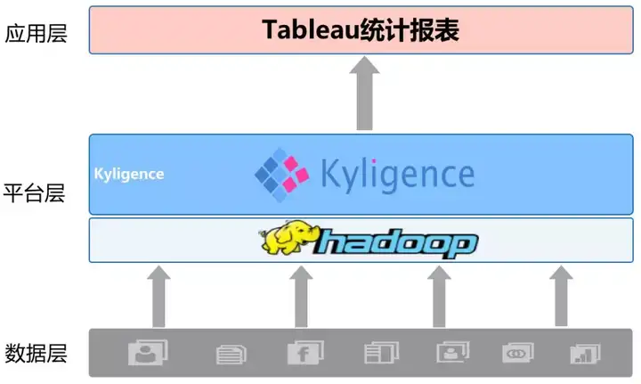 新的大数据平台架构为 Hadoop + Kyligence Enterprise + Tableau。以前存放到传统RDBMS 中的各系统数据,通过集中处理之后统一存入到 Hadoop 平台;并在Kyligence Enterprise 中依据不同的业务创建不同主题的数据集市和立方体,然后将业模型发布给业务分析人员。
