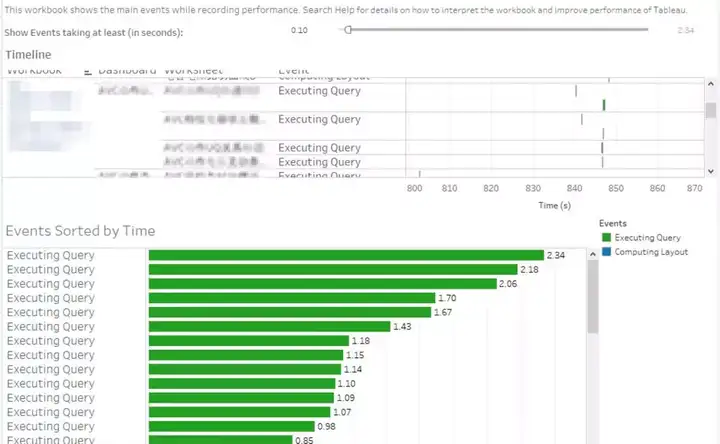 在某客户百亿级别的自助分析场景中,将原有平台迁移至 Kyligence 的方案后,通过 Tableau 自带的性能记录功能,我们能够很明显地看到 Kyligence Enterprise 的性能表现情况及其强大的性能优势,对比旧有方案分钟级甚至小时级别的响应表现,有数十倍以上的性能提升,且整体表现稳定: