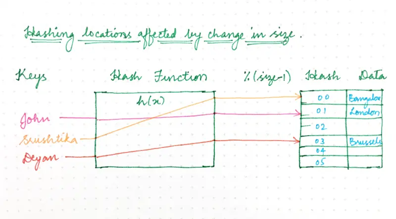 经典的哈希方法用一个哈希函数来生成一个伪随机数,然后这个伪随机数被内存空间大小整除,从而将一个随机的数值标识转换成可用内存空间里的一个位置。就如同下面这个函数所示: