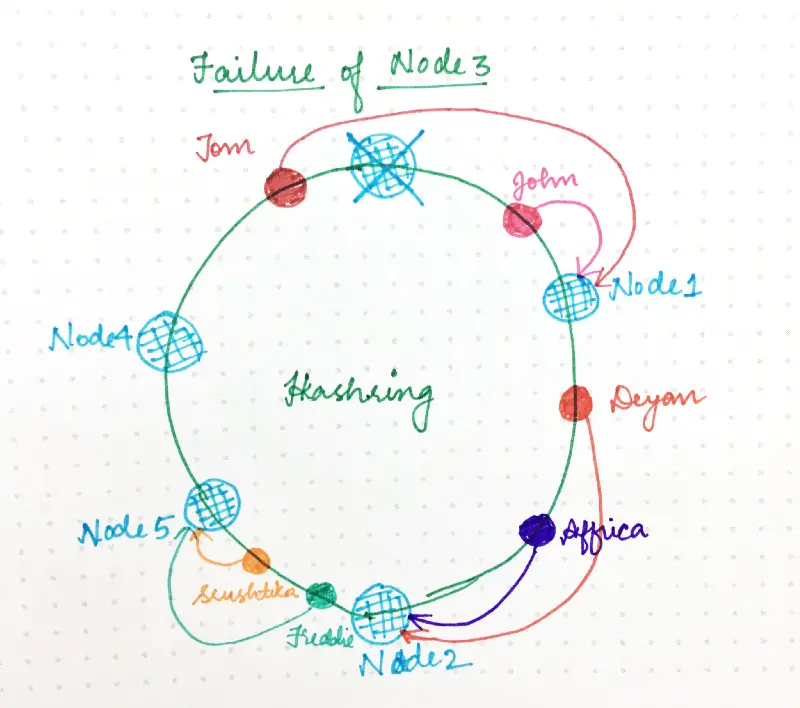 在这篇文章的开头我们已经看到了,当一个节点被添加,哈希环上的一部分区间范围,以及它所包括的各种请求,都必须被分配到这个新节点。反过来,当一个节点被删除,过去被分配到这个节点的请求都将需要被其他节点处理。