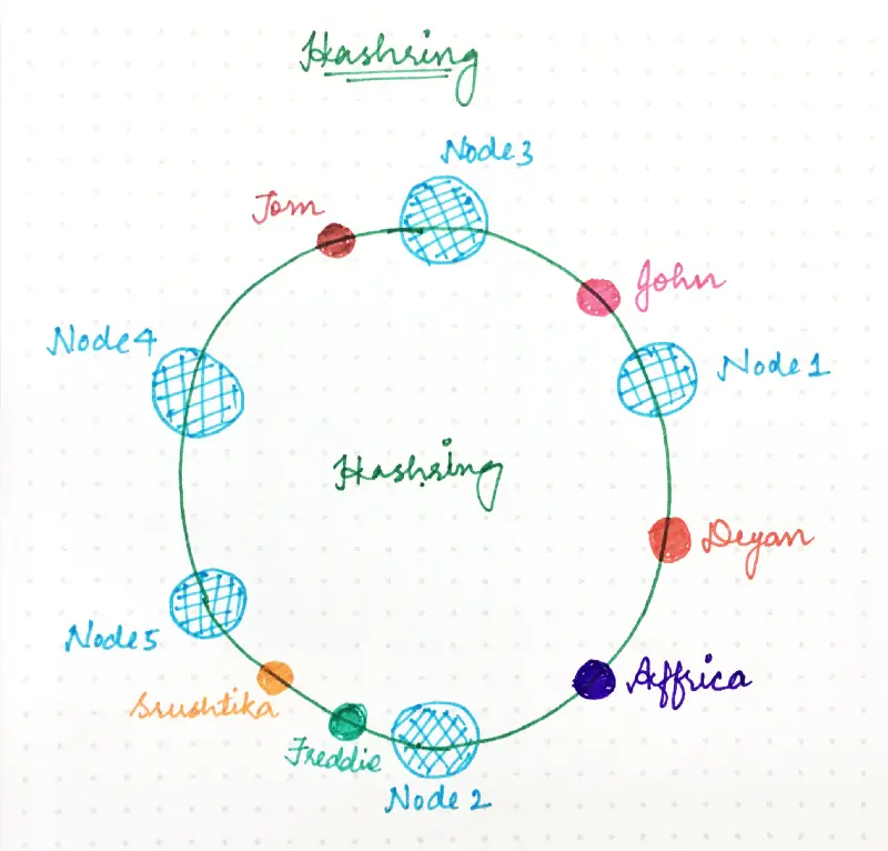 - 请求,例如用户,计算机或者无服务(serverless)程序,这些就等同于传统哈希方法中的键,也使用同样的哈希函数被放置到同样的环上。