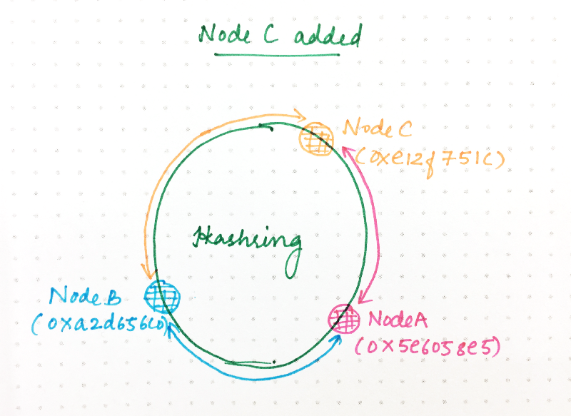 现在,0xa2d65c0 + 1 和 0xe12f751c (以前是属于A的部分)之间的环空间被分配给了 C。所有其他的请求像以前一样继续被哈希到同样的节点。为了处理节点职责的变化,这个范围内的已经分配给 A 的所有请求需要将它们的所有状态转移给 C。