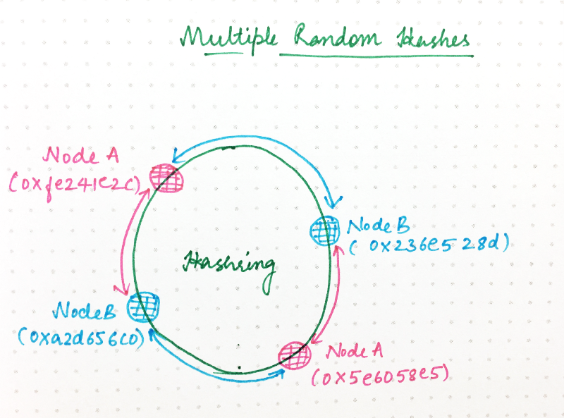 让分布更均衡合理的一种方法是为每个节点产生多个随机哈希,像下面这样: