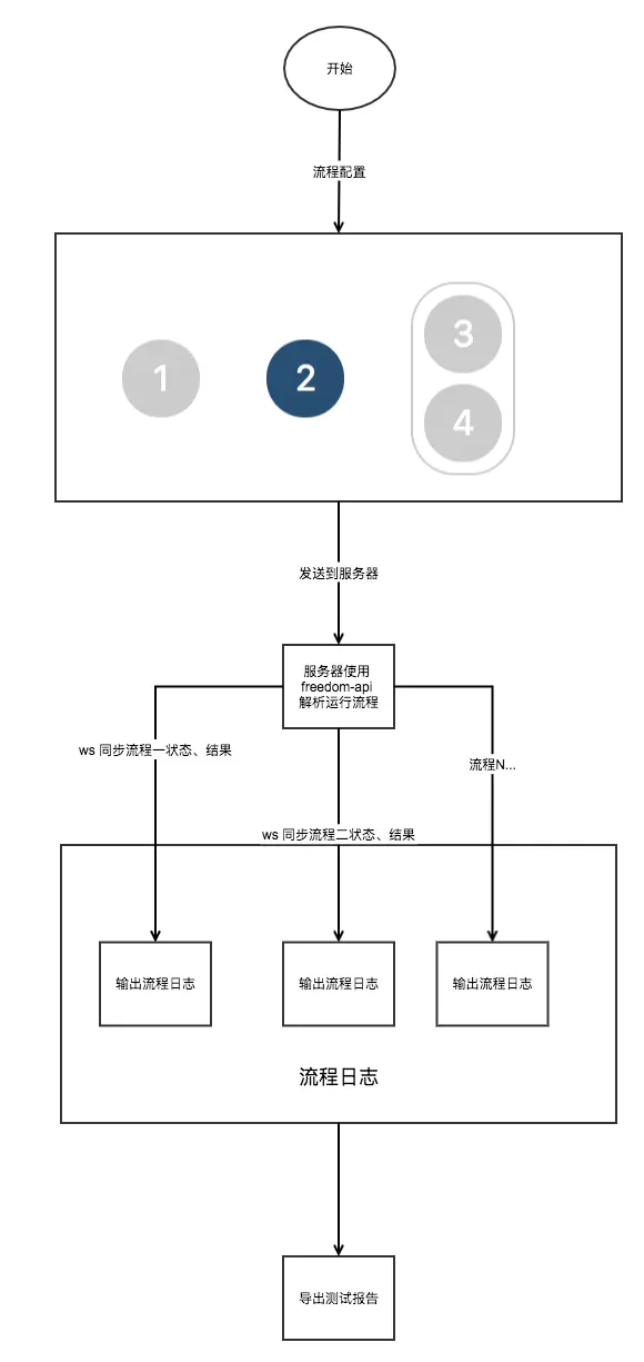 - 点击执行按钮,客户端将会和服务器端建立一个 web socket 连接,同时格式化流程定义发送到服务器端,服务器端在执行具体一个请求流程的前后,实时同步请求信息到客户端,客户端显示流程日志