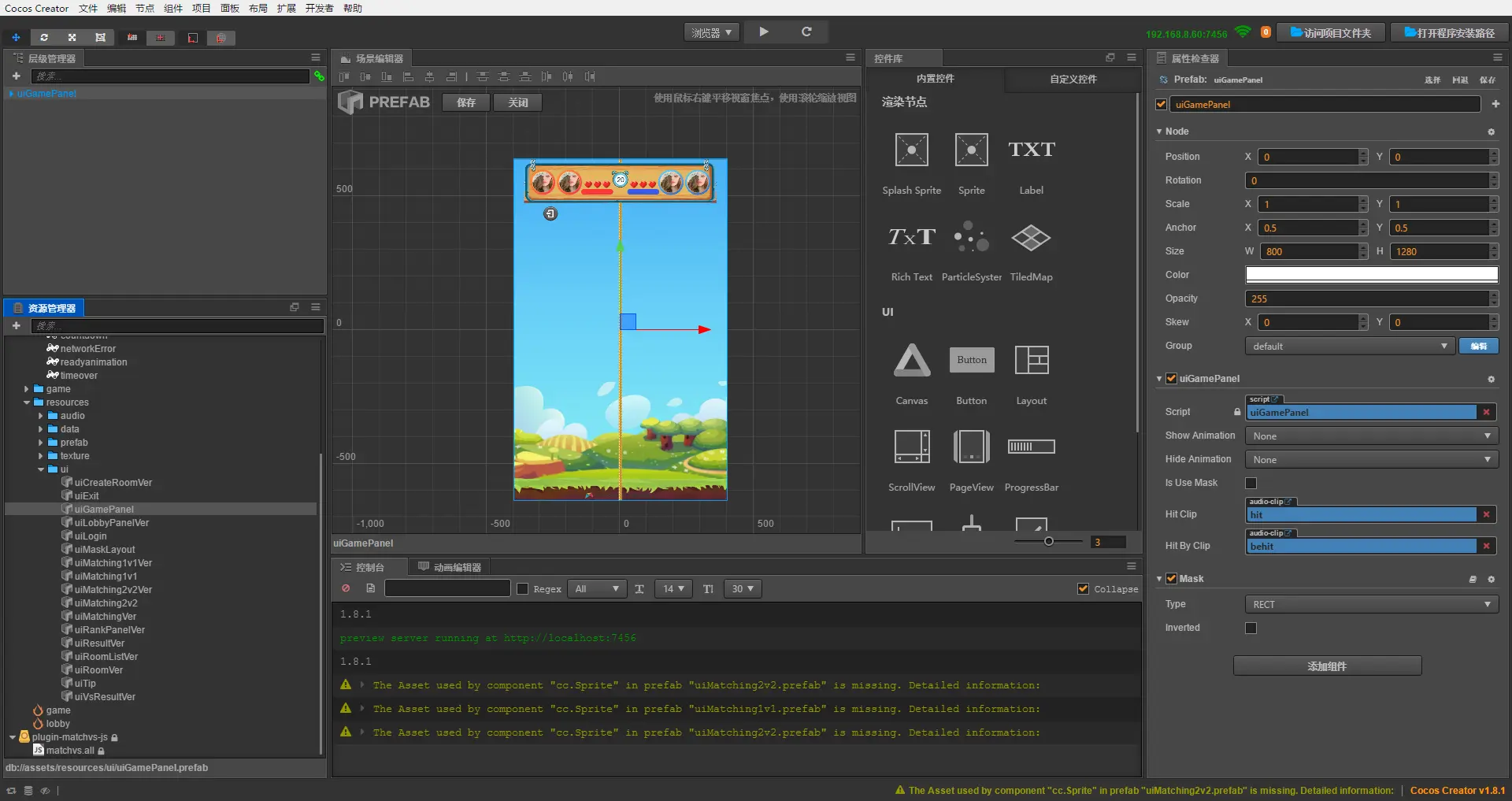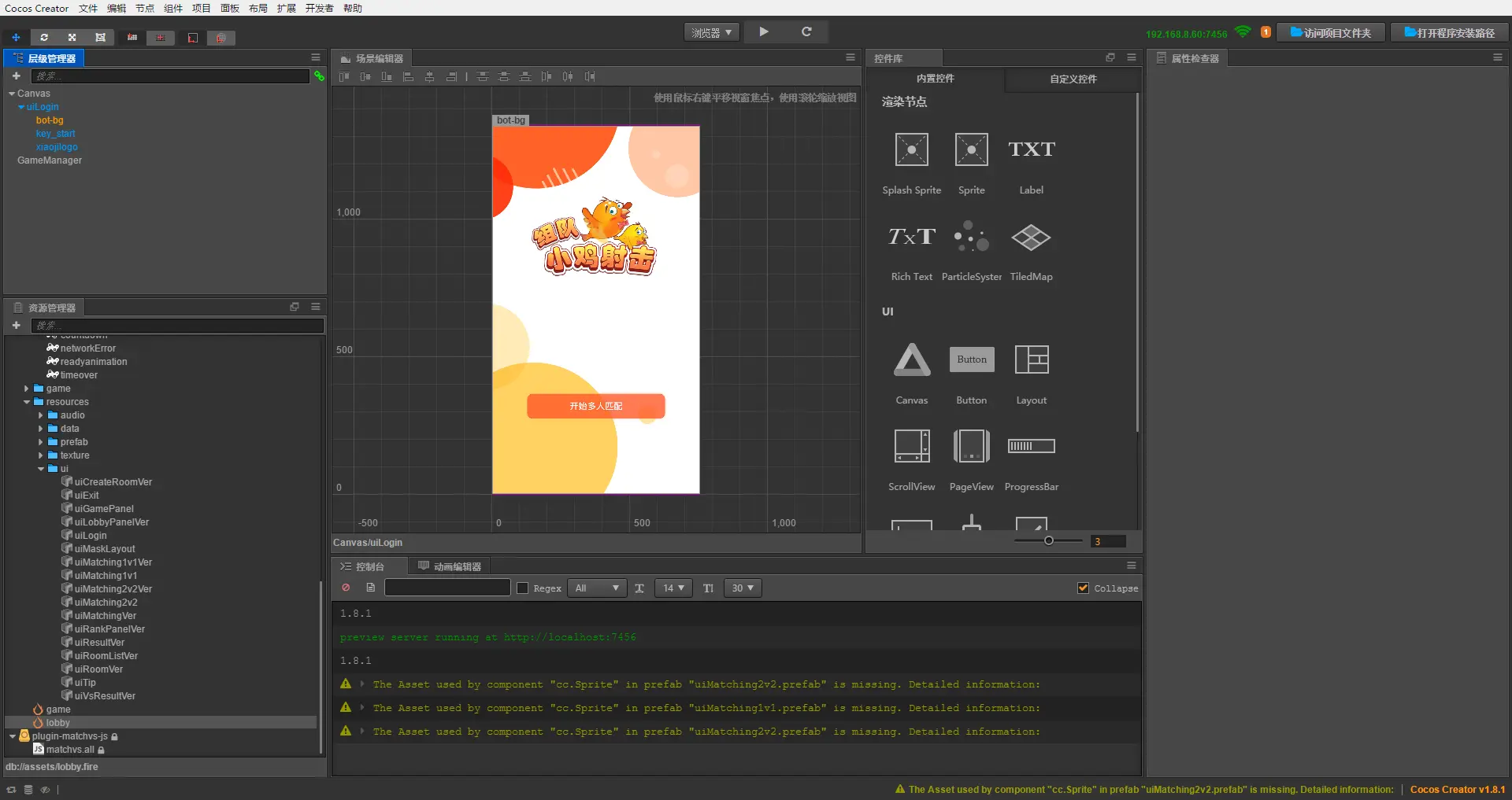 使用CC创建大厅场景(uiLobbyPanel.fire)给用户选择匹配方式,创建匹配场景(uiMatching1v1.fire) 给用户反馈比配进度