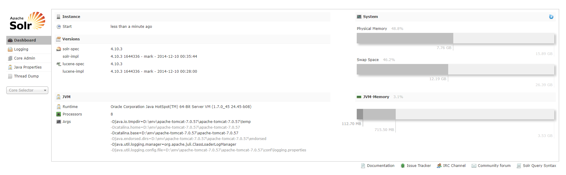 仪表盘,显示 solr 实例运行时间、版本、系统资源、jvm等信息。 、