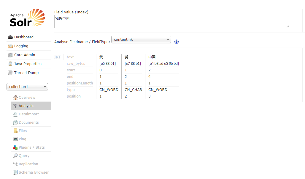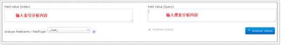 通过此界面可以测试索引分析器和搜索分析器的执行情况。 注:solr 中,分析器是绑定在域类型中的。