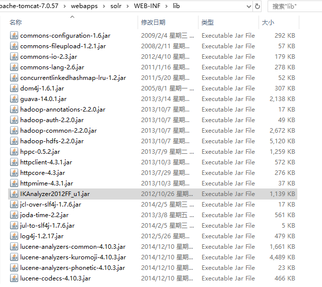 - 添加 solr 扩展服务包。将 solr-4.10.3\example\lib\ext 目录下 jar 拷贝到 tomcat solr WEB-INF lib 目录下