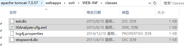- 添加 log4j.properties。拷贝 solr-4.10.3\example\resources 目录下 log4j.properties 到 apache-tomcat-7.0.57\webapps\solr\WEB-INF\classes ,目录不存在没有则创建。