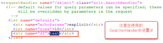 <str name="df">text</str><!--默认搜索字段-->