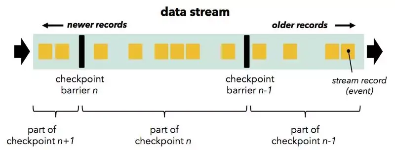 这类似于微批处理方法,其中两个检查点之间的所有计算都作为一个整体原子地成功或失败。 然而,这个就是两者唯一的类似点。 Chandy Lamport 算法的一个重要特点是我们永远不必按流处理中的“暂停”按钮,用来等待检查点完成后安排下一次 Batch 数据处理。 相反,常规数据处理始终保持运行,而状态持久化仅在后台发生。 以下引用原始论文,