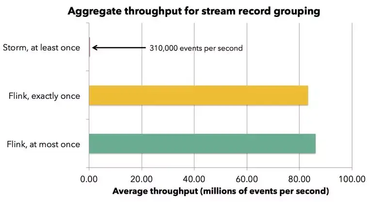 在 Storm 集群上,当我们关闭记录确认机制(即没有任何数据准确性保证),Storm 处理吞吐能力是每核每秒约 82000 条记录,99% 的处理延迟在 10 毫秒以内,因此整个 Storm 集群的总吞吐量为每秒 57 万条记录。当启用记录确认(即保证数据至少处理一次,at-least-once)时,Storm 的吞吐量降至每核每秒 4700 条记录,同时 Storm 的延迟也增加到 30-120 毫秒。 接下来,我们使用 Storm Trident,其微批量大小为 200000 个元组。 Trident 实现了每核每秒 75000 条记录的吞吐量(集群总吞吐量与 Storm 原生处理机制在关闭容错机制情况下整体吞吐量大致相同)。然而,这个集群吞吐性能是以 3000 毫秒的延迟(99% 的百分位数是 3000ms)为代价换来的。