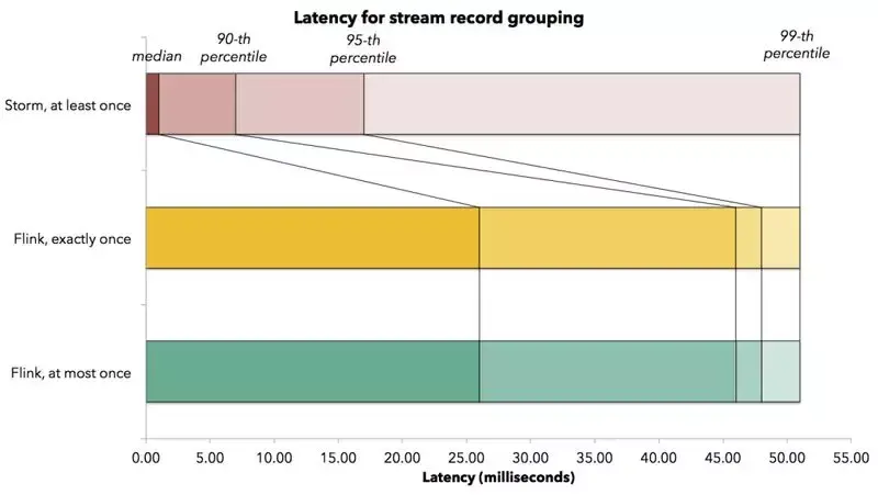 当应用程序开发人员评估一套流式处理系统性能延迟时,他们通常需要一个底层处理系统告之他们延迟分布情况。我们设计一个实验,测量业务主键聚合场景下作业的延迟分布情况,该作业由于存在主键聚合,因此需要流式系统内部数据跨网络混洗。下图显示了延迟分布情况,包括延迟中位数、延迟第 90% 位数、第 95% 分位数、第 99% 分位数(所谓第 99% 分位数的 50 毫秒延迟,意味着 99%的元素延迟不超过 50 毫秒)。