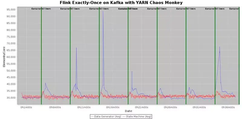 同样,我们在一个 30 节点的集群中运行这个程序,其中“YARN chaos monkey”进程每 5 分钟将随机杀死一个的 YARN 容器。 我们保留备用 worker(即 Flink 中的 TaskManagers),这样系统可以在发生故障后立即获取到新资源并运行作业,而无需等待 YARN 启动新的容器。接着,Flink 将重新启动失败的 worker 并在后台将其加入到 Flink 调度集群中,以确保备用 worker 始终可用。