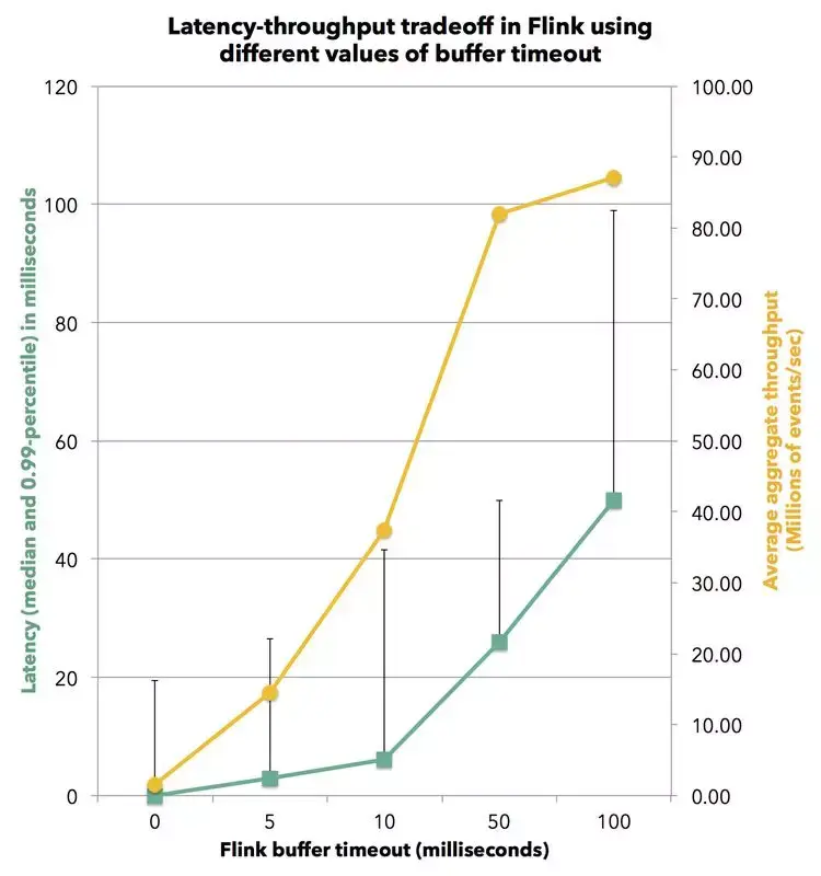 对于大多数应用程序而言,重要的是能够在可接受的延迟中维持较高吞吐量,延迟的具体需求取决于特定应用程序的业务要求。 在 Flink 中,用户可以使用称之为 Buffer Timeout 的机制来调整延迟。为了提高性能,Flink 的 Operator 在将数据发送到下一个 Operator 之前会将数据暂存在缓冲区。通过指定缓冲区超时时间,例如设定 10 毫秒,我们可以告诉 Flink 当面临 1) 缓冲区已满 2)10 毫秒已过 的情况下发送当前缓冲区所有的数据。 通常来说设定一个较低的缓冲区超时间将优化流式处理的延迟,但随之而来的是会降低相应的计算吞吐量。 在上面的实验中,我们将 Flink 缓冲区超时设置为 50 毫秒,这解释了为什么第 99 百分位的是 50 毫秒。