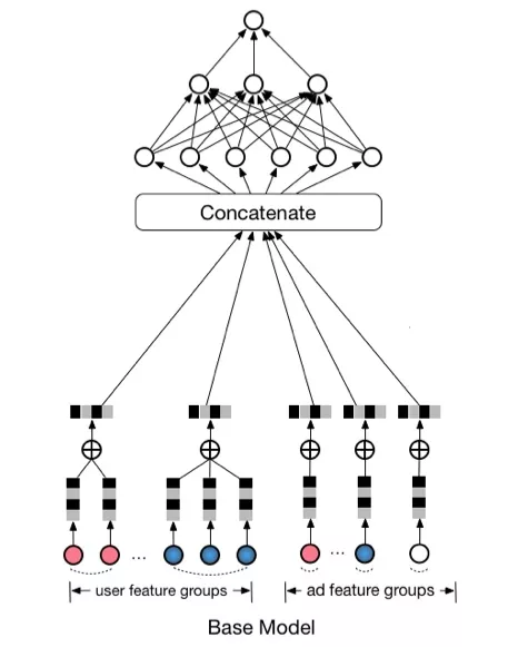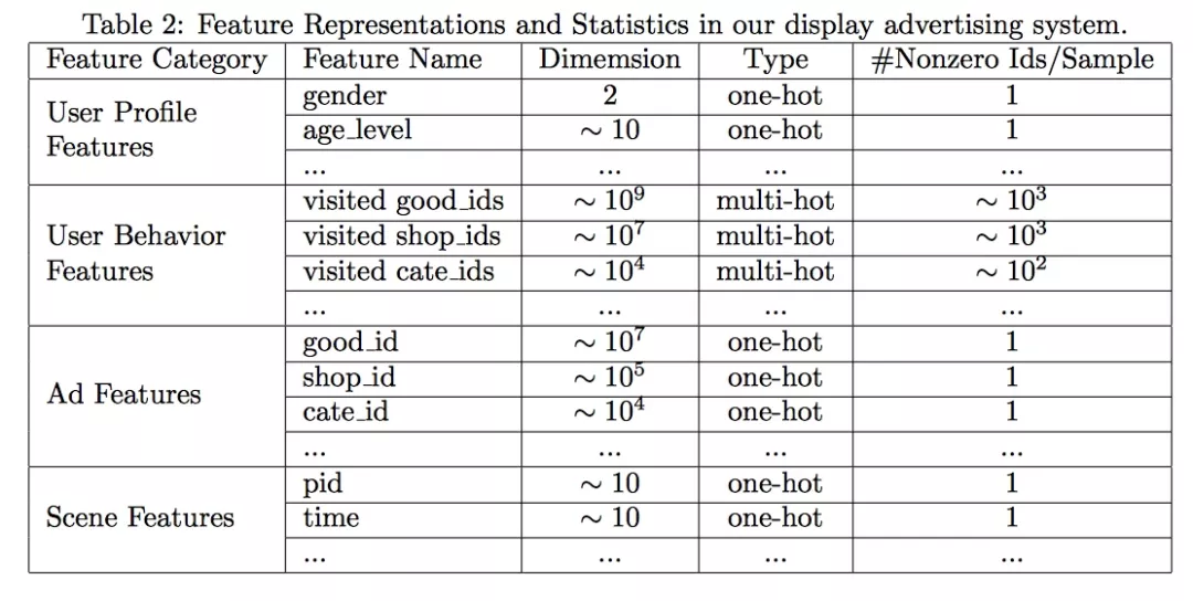 可以看到特征主要包括:用户特征、用户行为特征、广告特征、上下文特征。