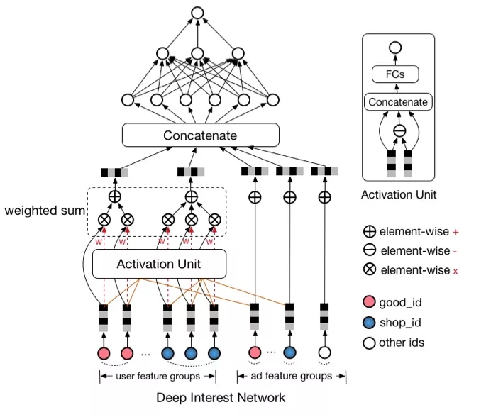 DIN 使用 activation unit 来捕获 local activation 的特征,使用 weighted sum pooling 来捕获 diversity 结构。