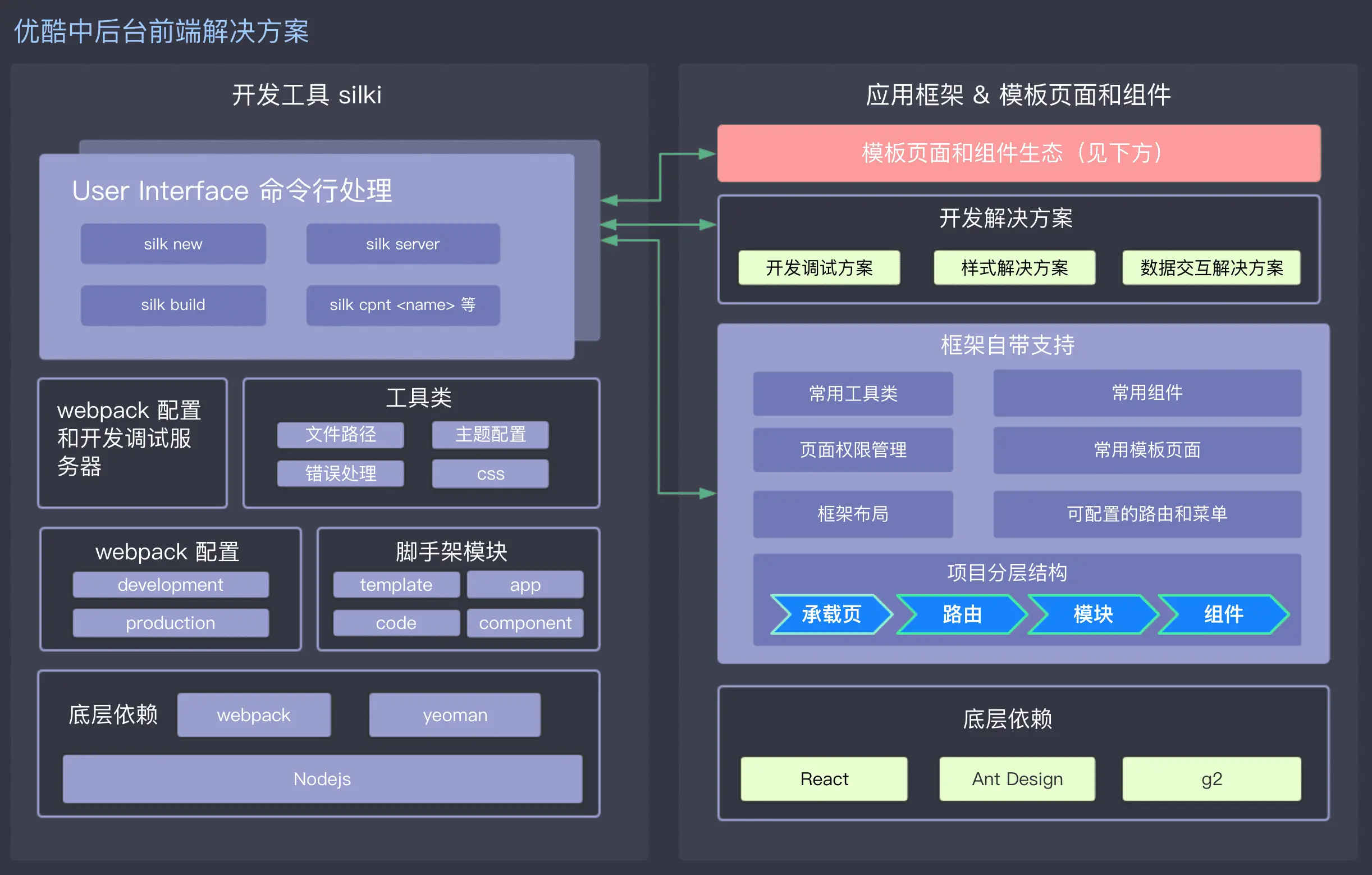 过客匆匆_ 2018-03-22 13:55:02 浏览6212 评论1摘要: 随着业务的快速发展,企业中后台的前端应用对于可用性和开发效率的要求越来越高。因此,我们开发了优酷中后台前端解决方案。该方案提供了开发中后台前端应用所需的框架、工具、组件和模板等。基于该方案,无论是前端、后端还是其它同学,可以快速搭建出优雅美观、简单易用的中后台前端应用。 > 系列文章 - [优酷中后台前端解决方案-总览](https://www.atatech.org/articles