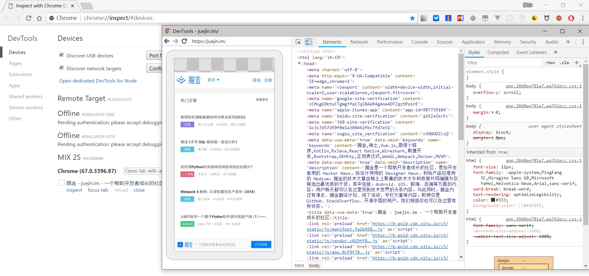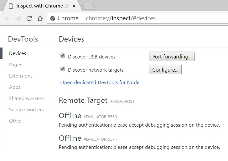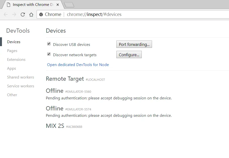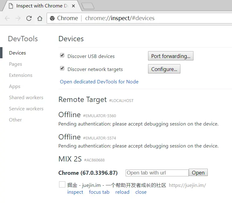 在 Chrome 浏览器地址栏中输入 chrome://inspect/#devices 并回车,就可以打开 Inspect 调试界面,此时我们勾选