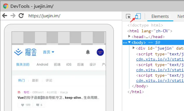 看到这个熟悉的界面了吗?接下来你便可以和调试 PC 界面一样通过 Chrome 进行你所需要的调试,你在左侧屏幕上做的一切操作和你的手机上的操作会始终保持同步,如果你嫌左边这块多余,也可以关闭 Toggle Screencast 只保留控制台本身。