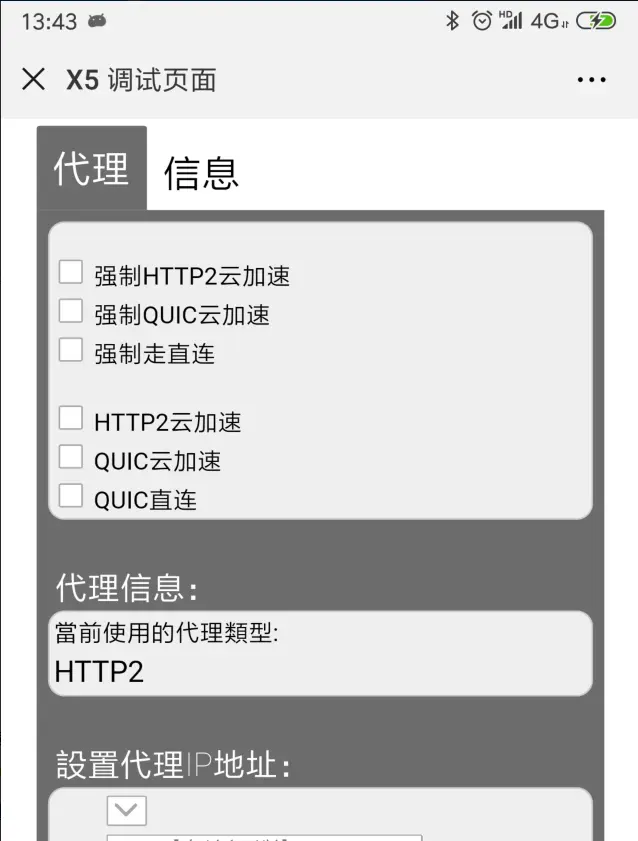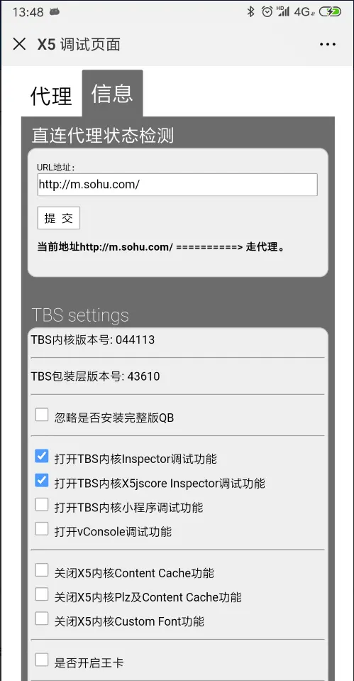 在这个页面中我们可以对 X5 内核进行配置(如非必要不建议改动配置),我们选择信息Tab并勾选“打开TBS内核Inspector调试功能”和“打开TBS内核X5jscore Inspector调试功能”两个选项,完成后重启页面生效
