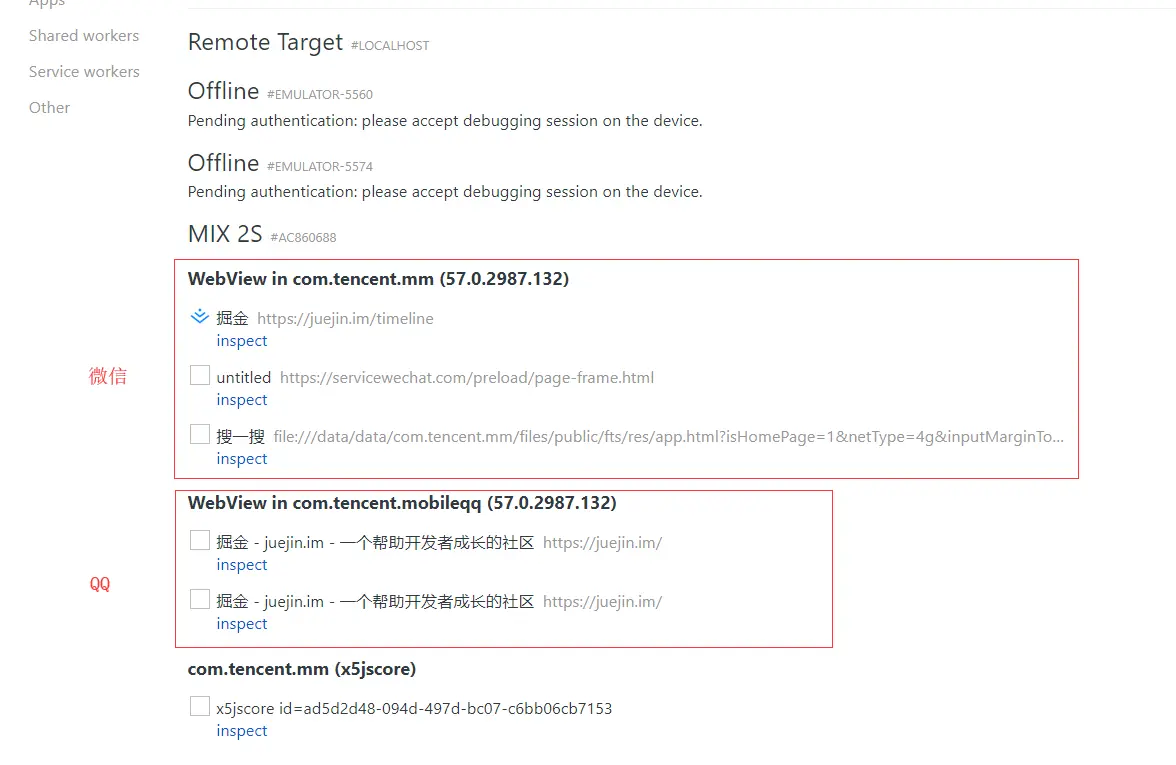 然后 inspect 页面就会自动刷新列表,这时我们就能对微信及 QQ 等 X5 内核 Webview 进行调试