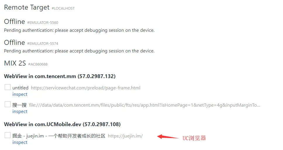 然后我们在 UC 开发版中打开要调试的页面,和上面一样,我们也可以在列表中看到 UC 浏览器打开的页面并对其进行调试