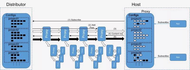 上图显示了LAD如何将代理组织到分发树中,分发树实际上是一个组织有序的点对点网络。如步骤1所示,代理代表在设备上运行的应用程序向分发器发送“订阅”请求。分发器通过向父节点发送“添加peer”请求(步骤2),将代理添加到分发树。一旦代理添加到了分发树,它开始接收元数据(步骤3)更新。这些被过滤,代理响应内容请求(步骤4)。如果父节点含有内容,它会立即发送到子节点;不然,它会从父节点下载内容(步骤5)。