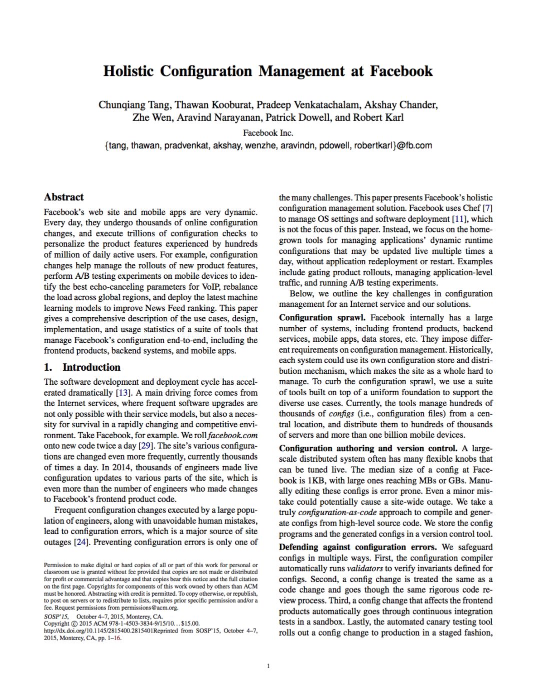 我们在2015年的SOSP论文中曾描述(https://research.fb.com/publications/holistic-configuration-management-at-facebook/),Facebook的配置管理系统(名为Configerator)使用开源分布式同步服务ZooKeeper来分发配置更新。