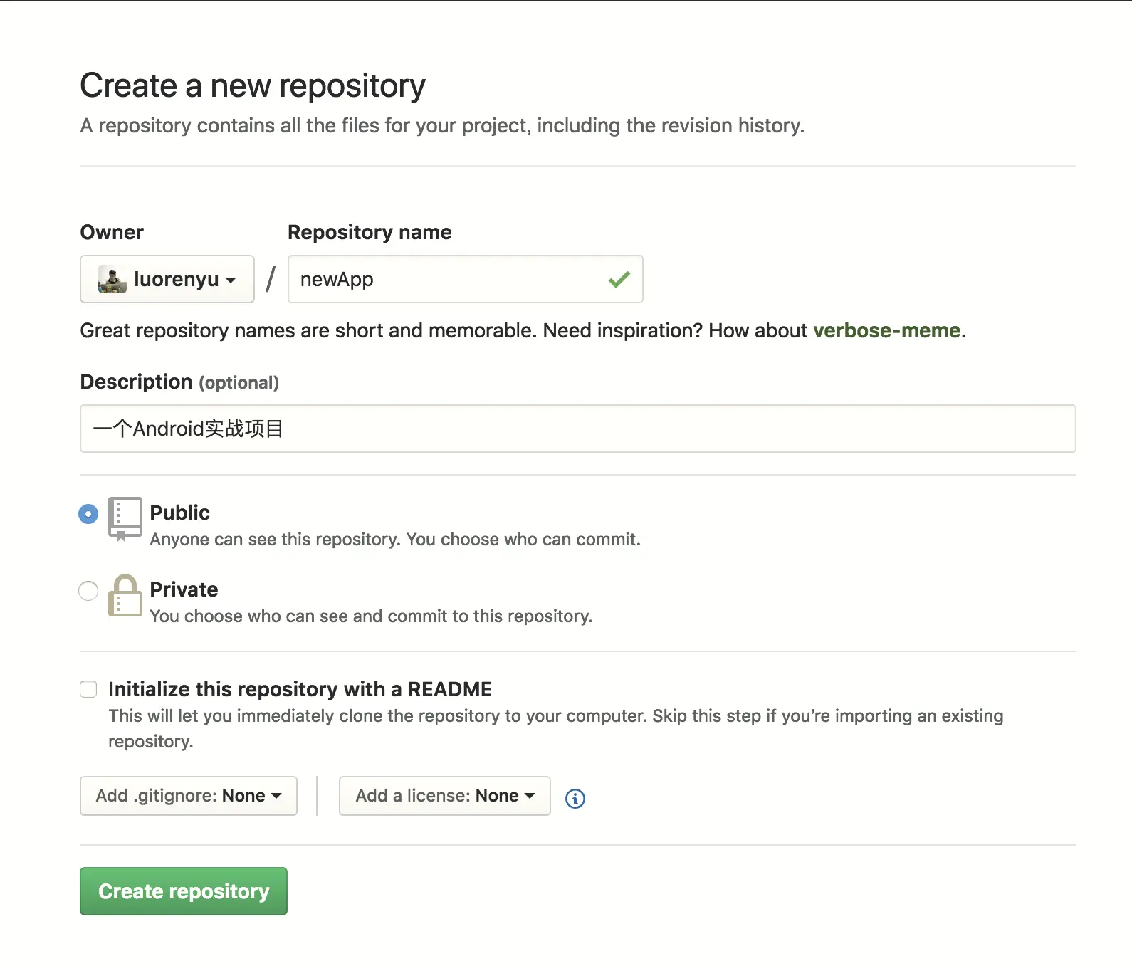 initialize this repository with a README:创建仓库的同时生成一个readme文件。