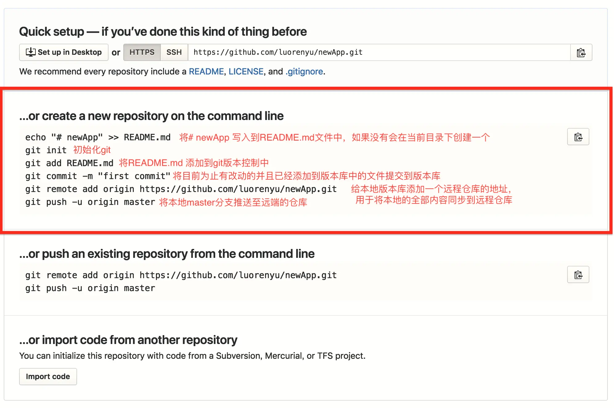 image我们根绝上图中红色框内的提示,用令行去创建一个新的repository并将其同步到远程仓库