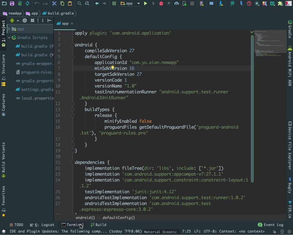 最后大家可能会发现你们的主题和我的主题不太一样,我用了一个Aandroid Studio 的插件Material Theme UI ,另外选择了AndroidStudio的黑色主题,所以看起来和你们的不太一样!