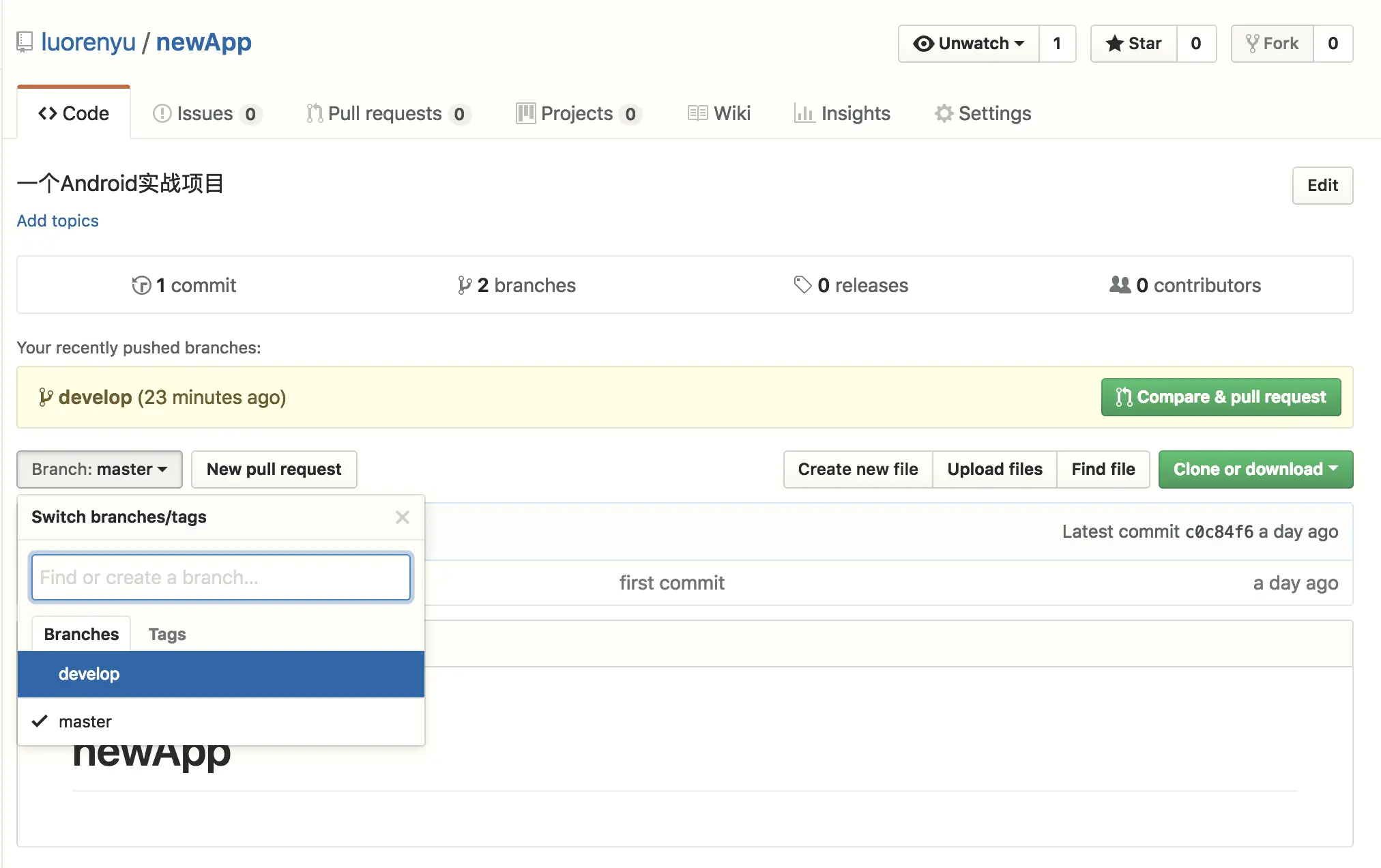 我们再次打开我们的github中newApp的项目会看到,在Branch master这里点击一下可以看到我们刚才提交的同步的develop分支。