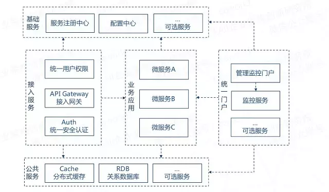 参考上图,在运行期,作为一个微服务架构的平台与业务系统,除了业务应用本身外,还需要有接入服务、统一门户、基础服务等平台级服务来保障业务系统的可靠运行。图中的公共服务就是业务处理过程中需要用到的一些可选服务。