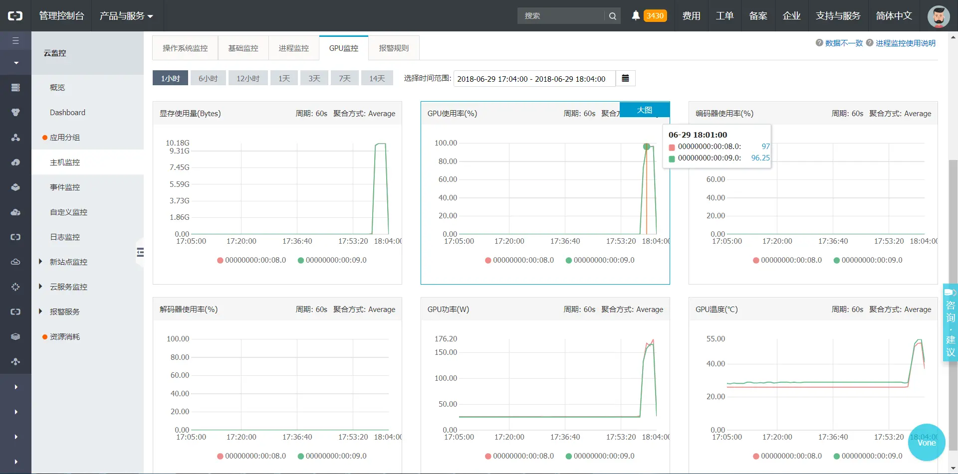 在云监控控制台中进入主机监控,进入需要查看监控数据的实例,点击GPU监控标签页,就可以看到该实例所有GPU的GPU使用率、编码器/解码器使用率、显存使用量、GPU功率、GPU温度等监控数据。