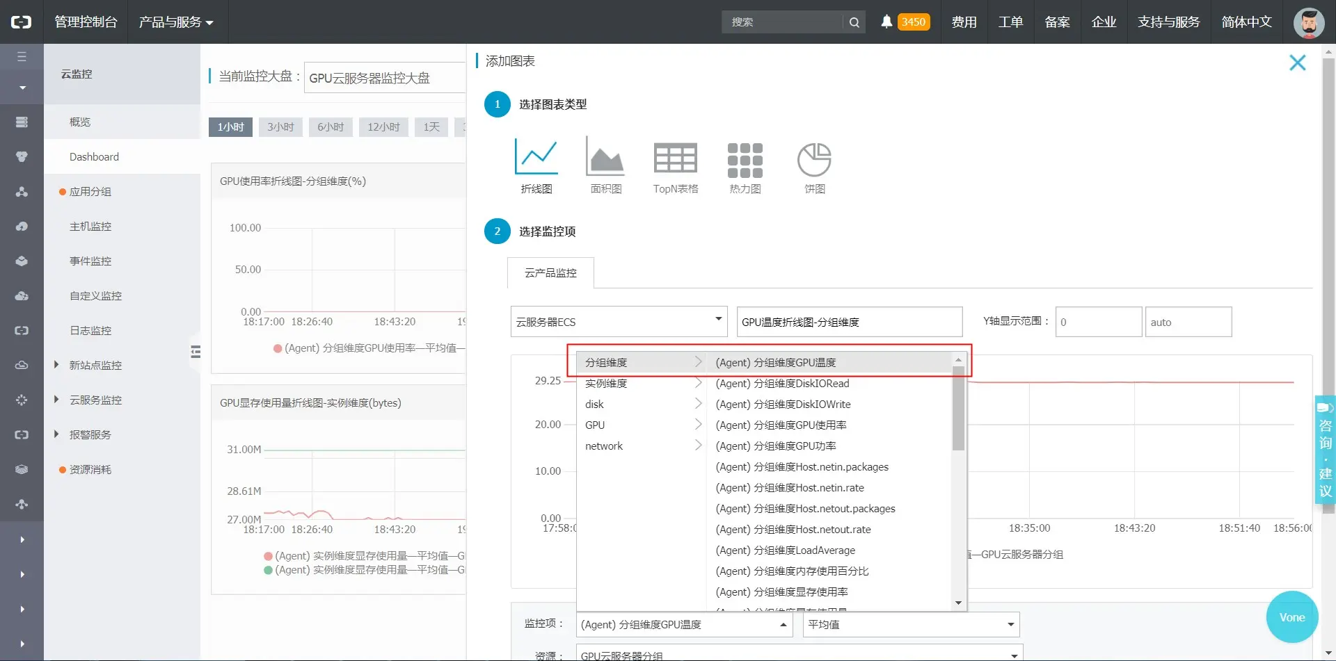 但是自定义监控的采集脚本需要用户自己实现,并且云监控控制台上自定义监控的展示维度也很有限,只能查看指定VM指定GPU的某个数据。