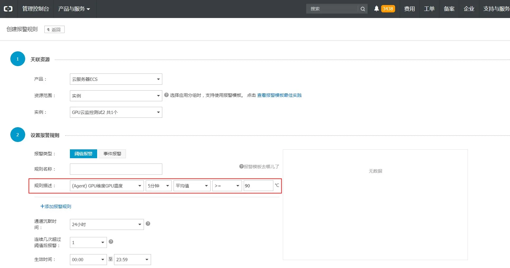 新增的GPU监控项添加报警规则方式同ECS的其他指标一样,可以针对某一特定指标设置报警规则,如下图: