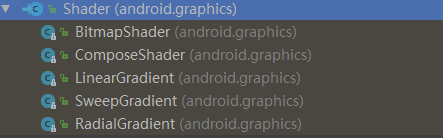 Paint除了直接设置颜色,还可以通过setShader方法设置着色器,其实用过ps的都知道,着色器其实就是一种颜色填充方式,单一的颜色,也可以看做是纯色的着色器,如果设置了着色器,那么颜色填充方式就以着色器的颜色信息为准。使用着色器并不能直接使用Shader类,应该使用其子类: