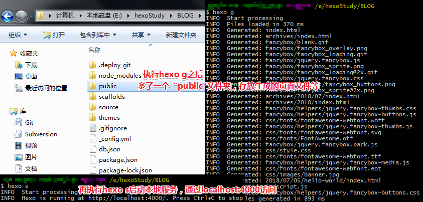 $ hexo generate #编译,生成静态文件,也就是public文件夹的东西(hexo g也可以)