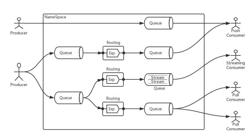 - namespace,类似cgroup的namespace,用来进行安全隔离,每个namespace有自己的producer、consumer、topic、queue等