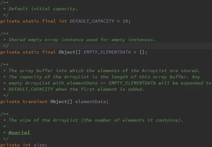 上面是基本的几个属性,注释中都说的比较清楚了,DAFAULT_CAPACITY是默认初始化的数组大小,EMPTY_ELEMENTDATA是一个用来判断用的空数组,elementData是用来存放数据的数组,size则是记录元素的数量。