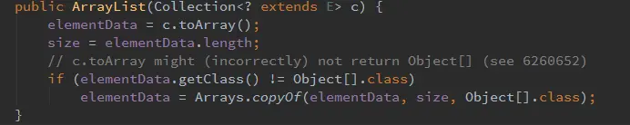 此处参数使用了泛型的类型通配符上限方式定义,限定了元素类型上限,对泛型不清楚的请点泛型解析回顾一下。这里的elementData和size都取目标集合转为数组的相关属性。检查elementData的元素类型如若非Object[]类型则使用数组拷贝的方式对elementData进行赋值。