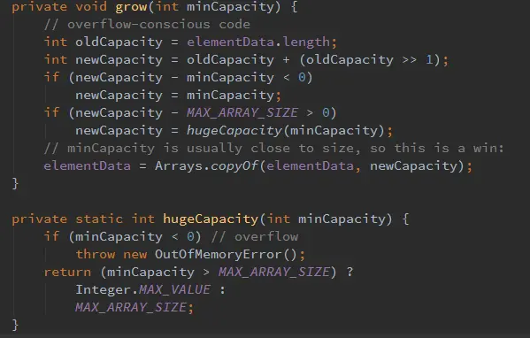 扩容操作中首先记录当前容量大小记录为old,定义新大小 为old的1.5倍(>>1 右移1位,即除以2),判断如果定义的新容量依然小于所需容量则使用所需容量大小作为新容量,接下来对大小的上限作判断最大为Integer的MAX_VALUE即为2^31-1,接下来继续使用数组的拷贝方法将老数组的数据全部拷贝到新数组中,完成扩容操作。 回到原add方法中,将新添加的元素放入数组尾端,完成添加元素操作。