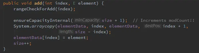 rangeCheckForAdd方法是确保目的的index合法,ensureCapacityInternal方法上面已经解析过了,作用是确保数组容量如不足够则进行扩容,