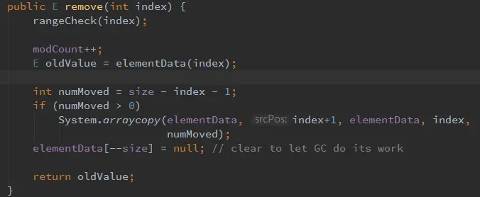rangeCheck是确保index合法的方法。取出即将移除的目标元素用来提供方法返回, 判断size-index-1是否大于0 ,也就是判断index是否在尾部,不在尾部的话将index+1及其后的元素全部向前移动一位,将老元素覆盖,后将数组的末尾元素置为null方便虚拟机触发gc,size自减。返回被删除的目标元素。根据下标删除元素操作完成