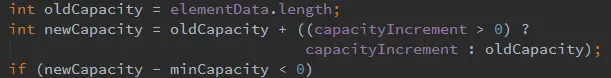 首先进行添加元素,给原来的size+1然后进行大小判断操作,如果最后得到的minCapacity大于当前的elementData长度,则需要进行扩容操作,进入grow方法,源码如下: