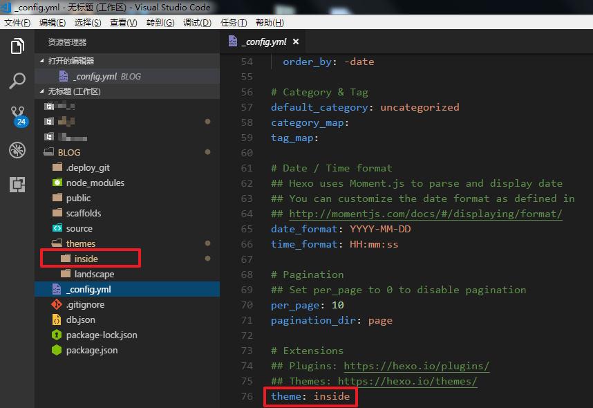 主题有了,需要全局配置一下才能生效。打开项目根目录下的_config.yml文件作修改并保存,执行hexo s启动本地服务查看效果